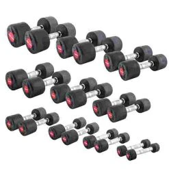 The Sport-Thieme rubber compact dumbbell set is available in 2 different versions. The small set consists of 10 pairs of dumbbells and the large set has 18. The weights are very robust and are ideally suited to intensive professional use in gyms and clubs. Thanks to the rubber covering, floors are protected and placing the dumbbells down does not make much noise.